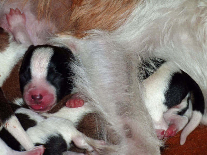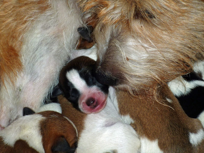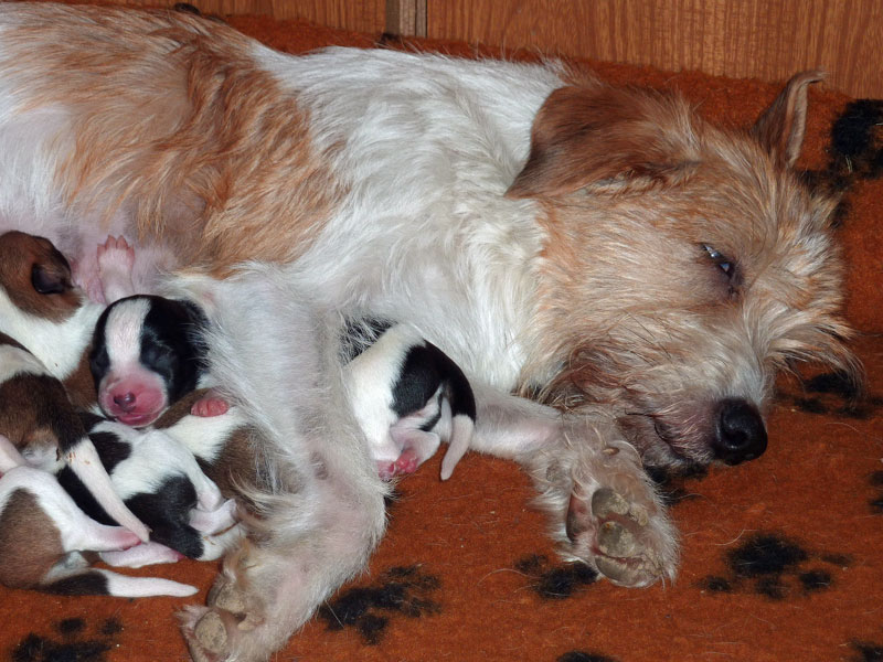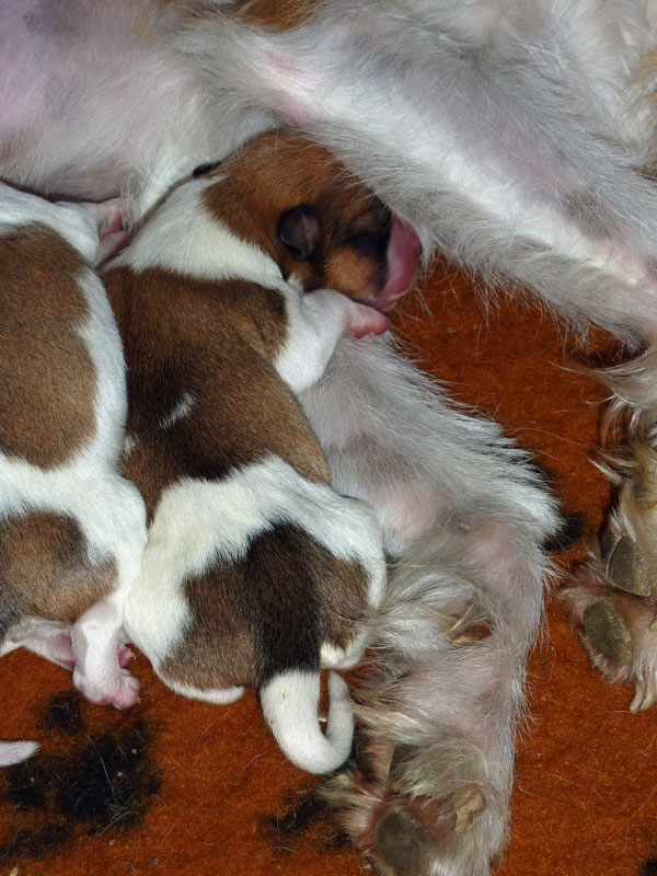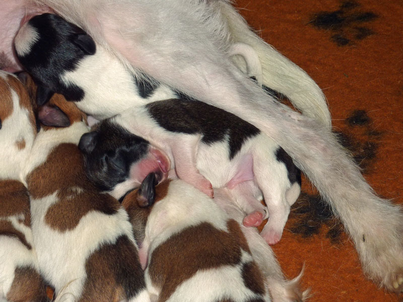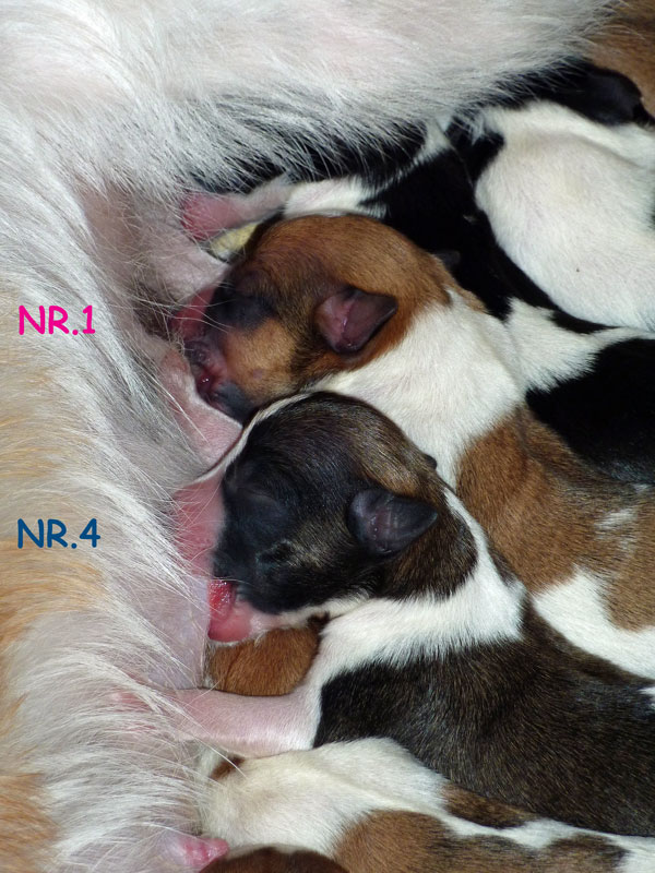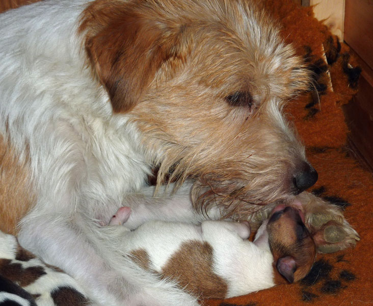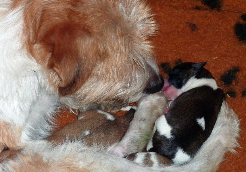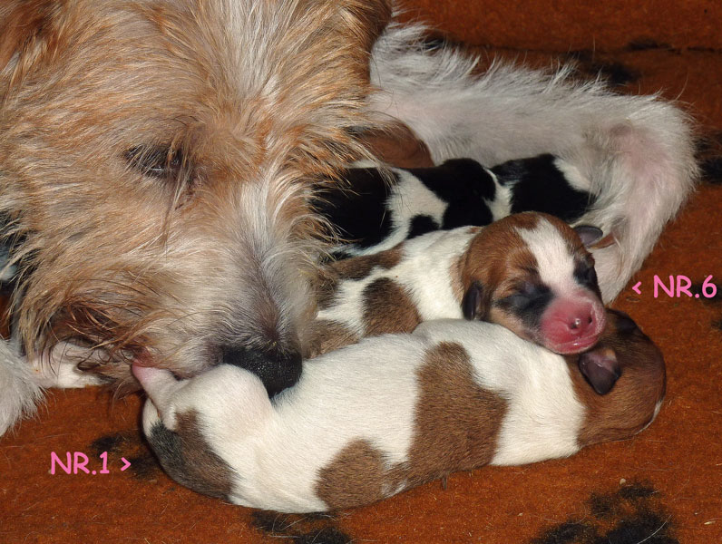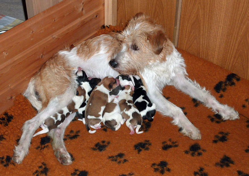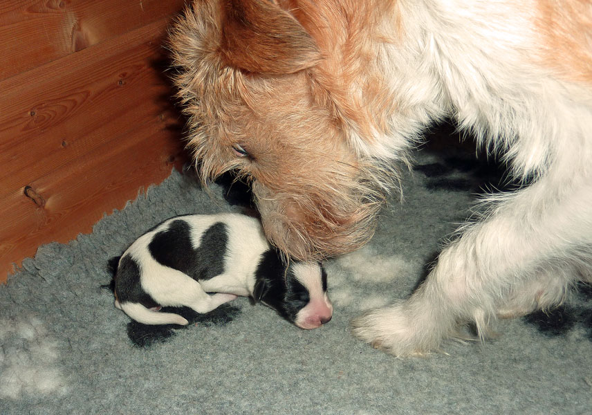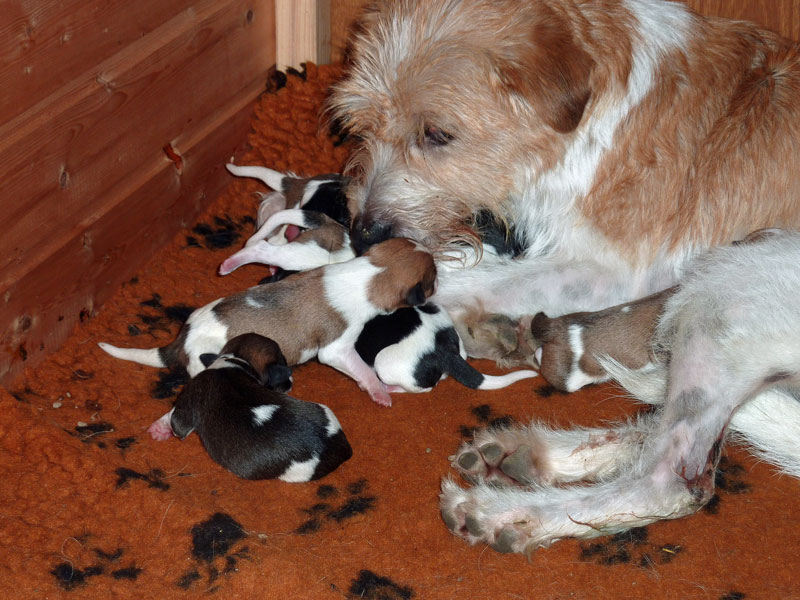 Positiv überrascht hat uns Billie ! Im Gegensatz zu Düse, die ihre beiden Würfe sehr antiautoritär erzogen hat, nimmt Billie ihre Mutterrolle sehr ernst. Beim kleinsten Quicken kontrolliert sie was los ist und wenn einer der Zwerge zu weit weg "rennt" wird er angesackt