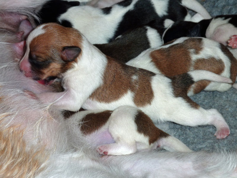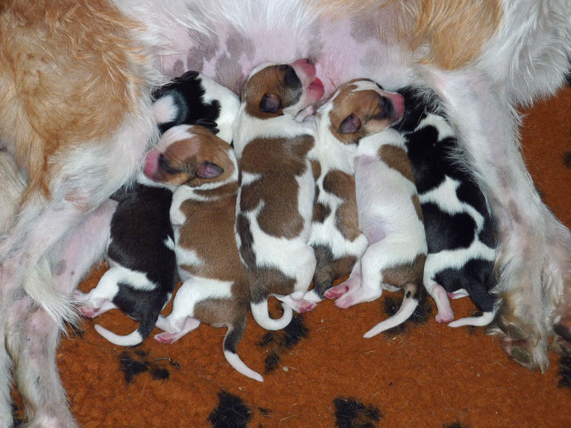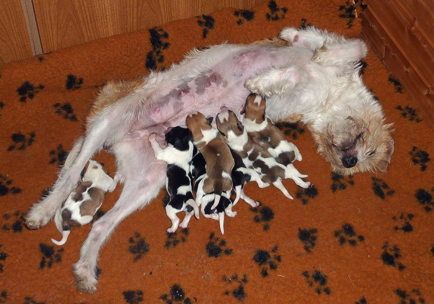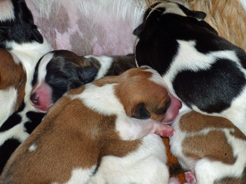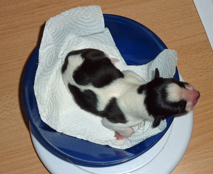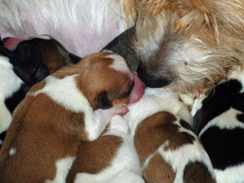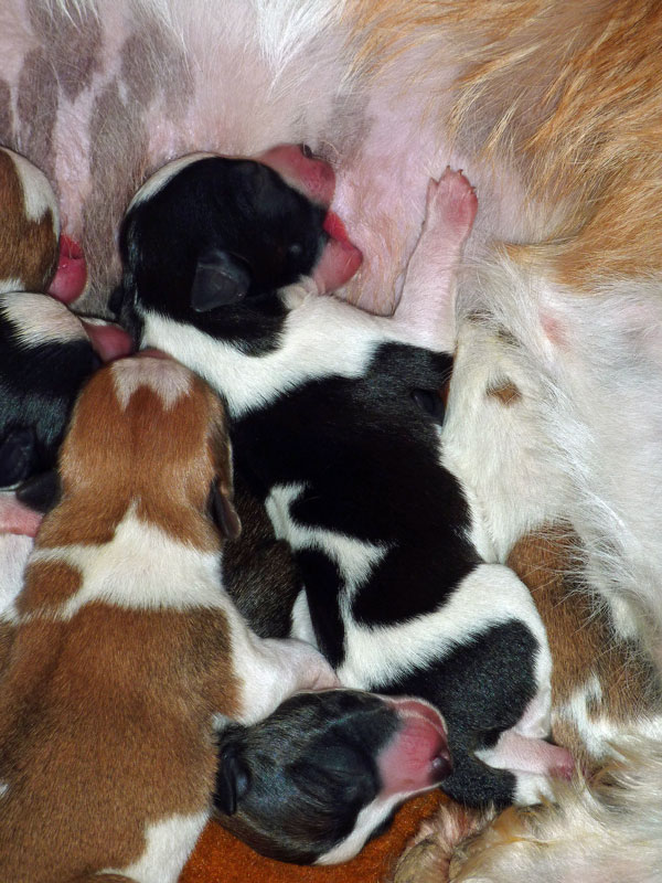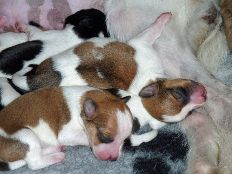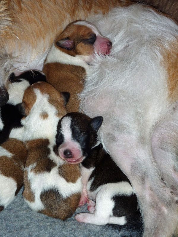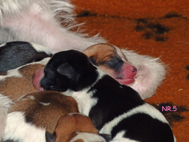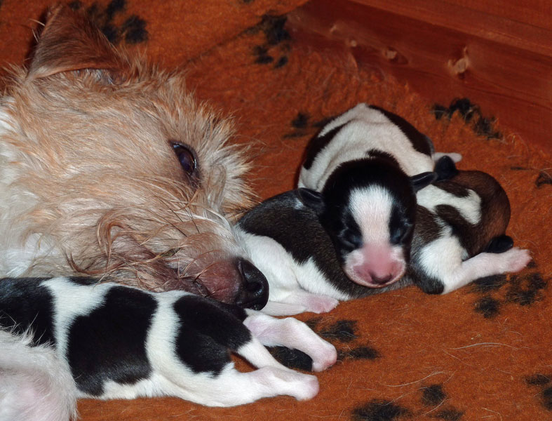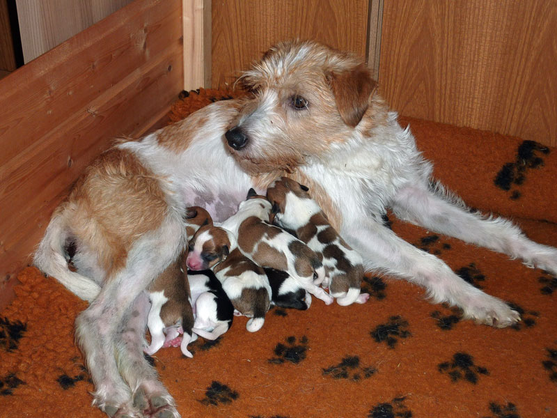 Positiv überrascht hat uns Billie ! Im Gegensatz zu Düse, die ihre beiden Würfe sehr antiautoritär erzogen hat, nimmt Billie ihre Mutterrolle sehr ernst. Beim kleinsten Quicken kontrolliert sie was los ist und wenn einer der Zwerge zu weit weg "rennt" wird er angesackt