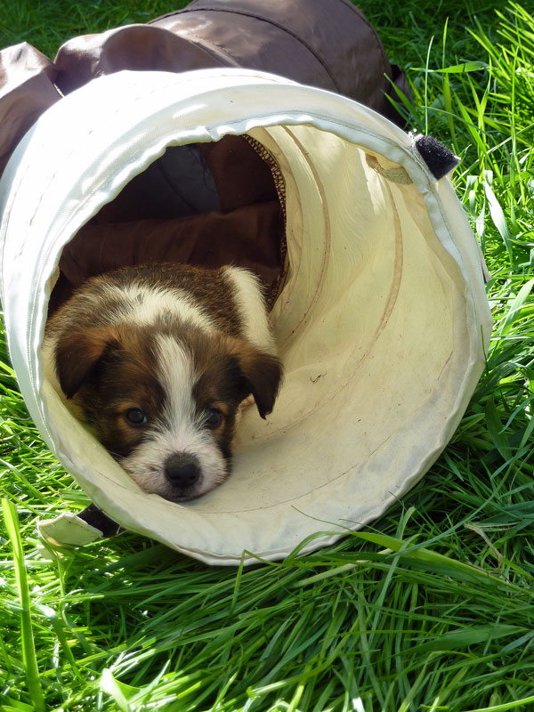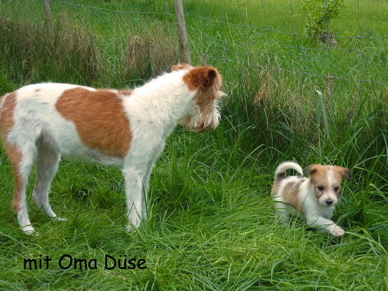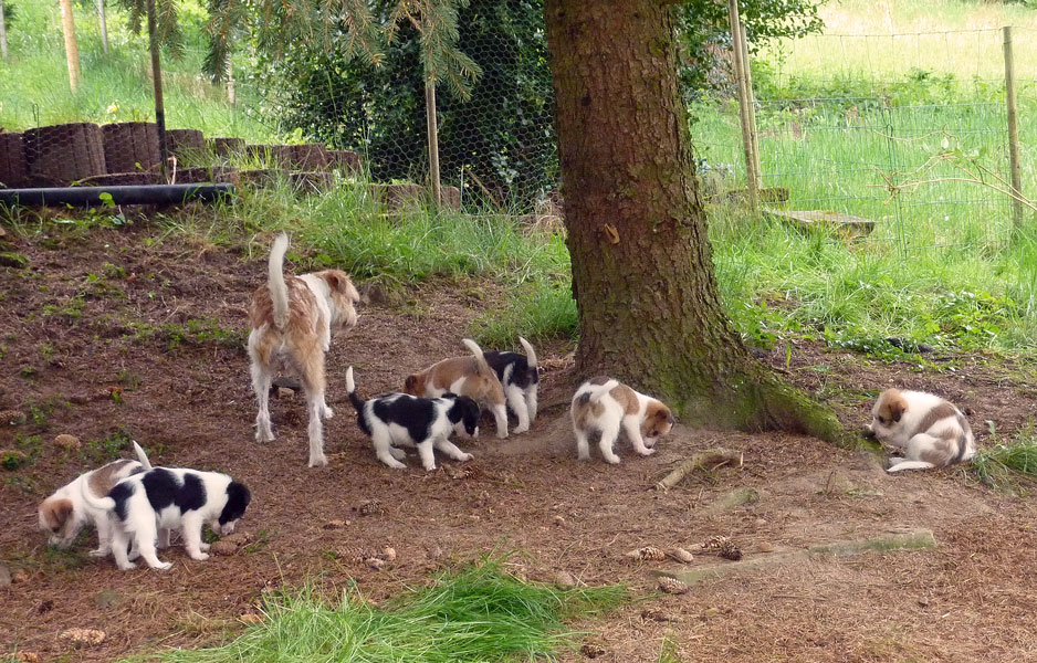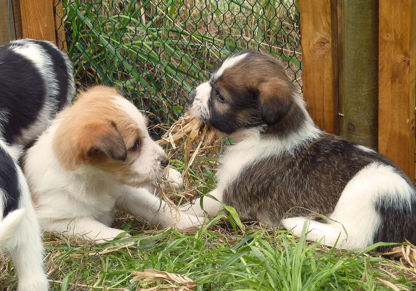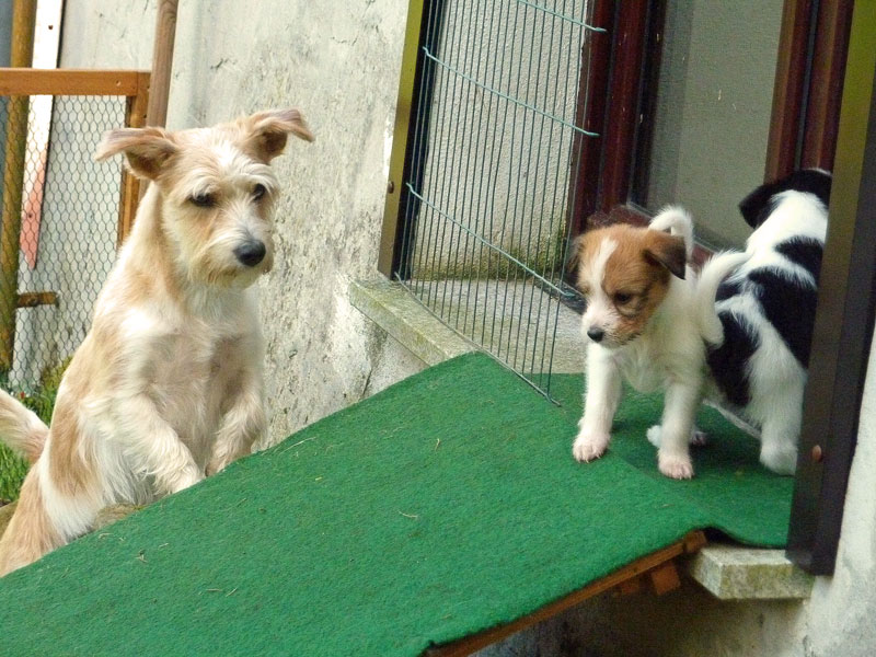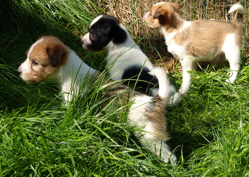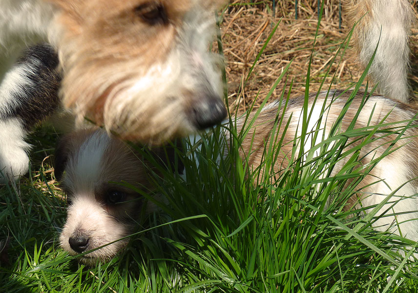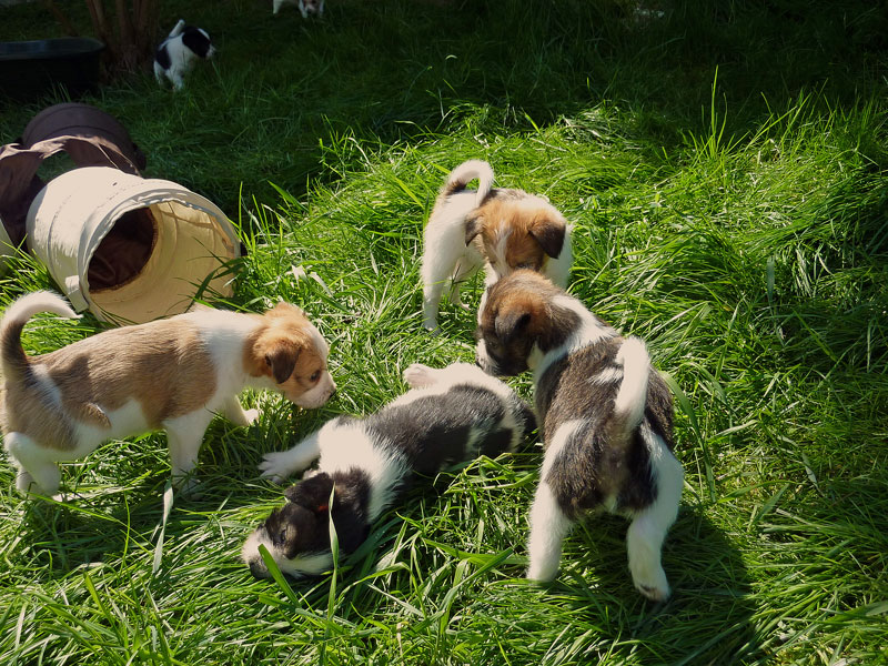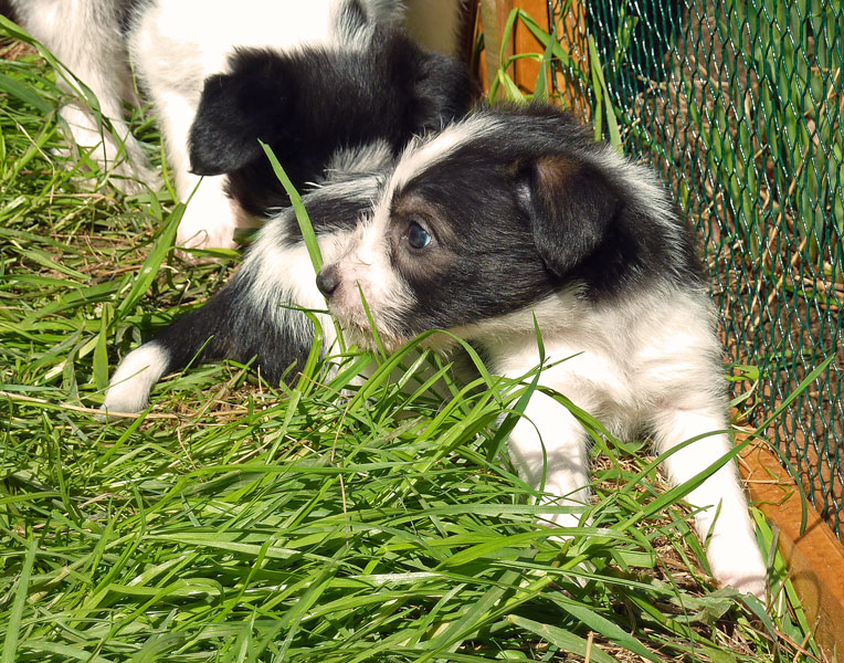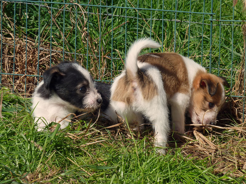Nachdem das Wetter uns letzte Woche einen dicken Strich durch die Rechnung gemacht hatte, konnten unsere kleinen Rabauken diese Woche endlich den Garten erobern. Jetzt haben sie ausreichend Platz zum Rennen und sammeln viele neue Eindrücke (Autos, Wanderer, andere Hunde etc. ). Auch die kleinen und großen Geschäfte werden so gut wie möglich draußen erledigt.
